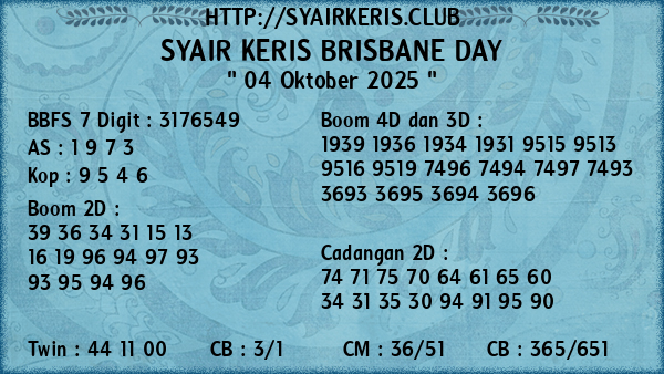 Prediksi Syair Keris Jitu Brisbane Day Sabtu, 04 Oktober 2025