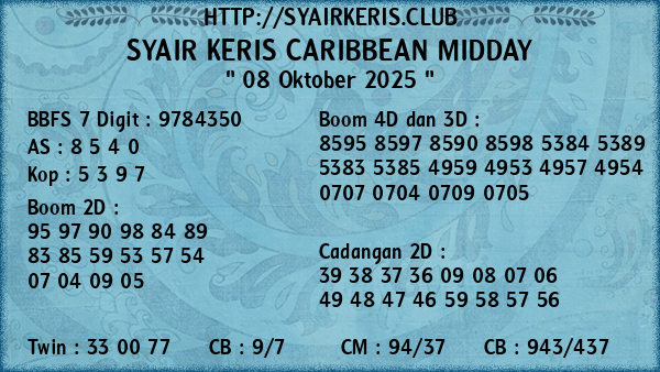 Prediksi Syair Keris Jitu Caribbean Midday Rabu, 08 Oktober 2025