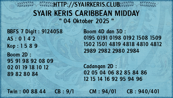 Prediksi Syair Keris Jitu Caribbean Midday Sabtu, 04 Oktober 2025