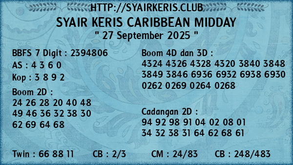 Prediksi Syair Keris Jitu Caribbean Midday Sabtu, 27 September 2025