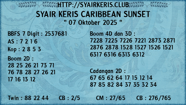 Prediksi Syair Keris Jitu Caribbean Sunset Selasa, 07 Oktober 2025
