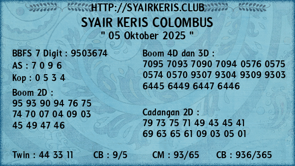 Prediksi Syair Keris Jitu Colombus Minggu, 05 Oktober 2025