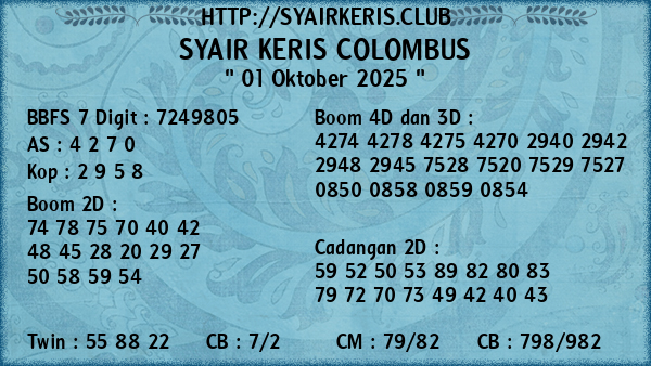 Prediksi Syair Keris Jitu Colombus Rabu, 01 Oktober 2025