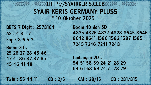 Prediksi Syair Keris Jitu Germany Plus5 Jumat, 10 Oktober 2025
