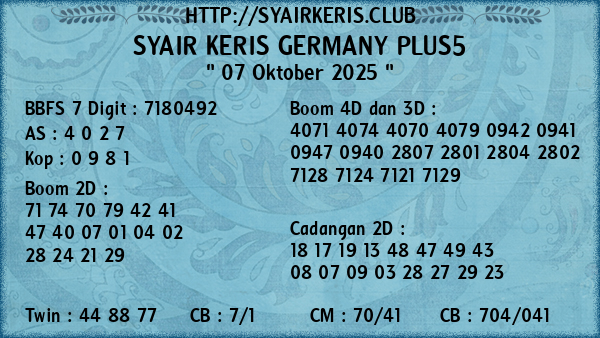 Prediksi Syair Keris Jitu Germany Plus5 Selasa, 07 Oktober 2025