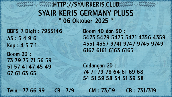 Prediksi Syair Keris Jitu Germany Plus5 Senin, 06 Oktober 2025