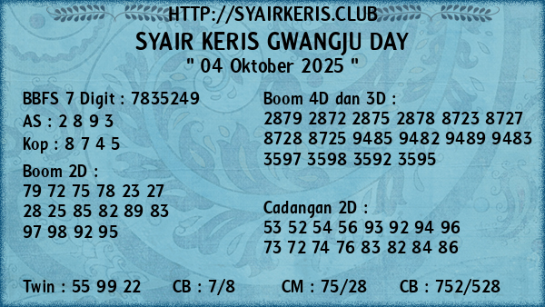 Prediksi Syair Keris Jitu Gwangju Day Sabtu, 04 Oktober 2025