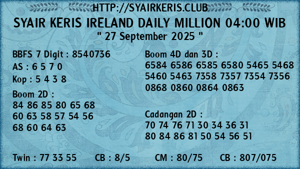 Prediksi Syair Keris Jitu Ireland Daily Million 04:00 WIB Sabtu, 27 September 2025