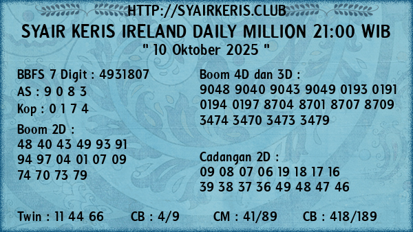 Prediksi Syair Keris Jitu Ireland Daily Million 21:00 WIB Jumat, 10 Oktober 2025