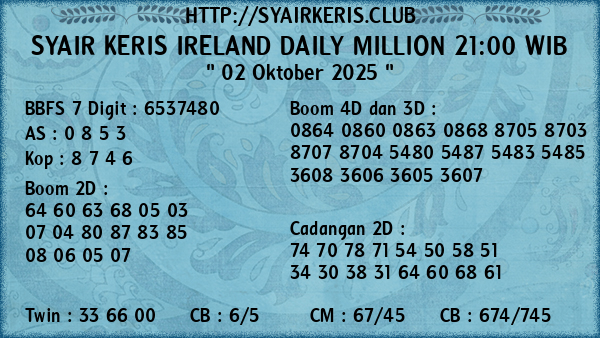 Prediksi Syair Keris Jitu Ireland Daily Million 21:00 WIB Kamis, 02 Oktober 2025