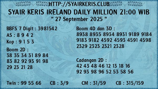 Prediksi Syair Keris Jitu Ireland Daily Million 21:00 WIB Sabtu, 27 September 2025