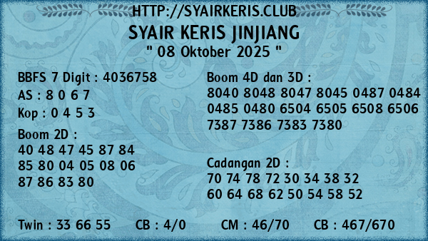 Prediksi Syair Keris Jitu Jinjiang Rabu, 08 Oktober 2025