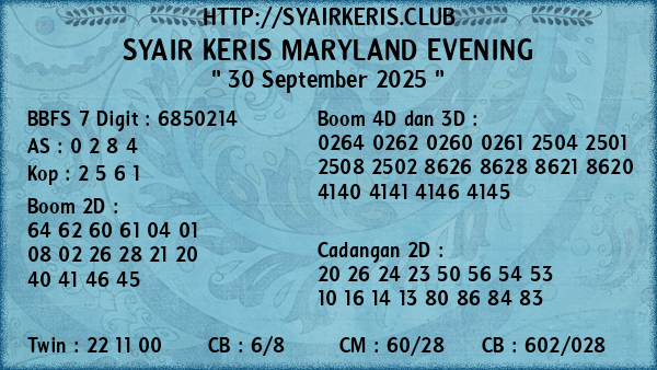 Prediksi Syair Keris Jitu Maryland Evening Selasa, 30 September 2025