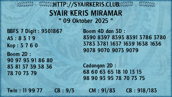 Prediksi Syair Keris Jitu Miramar Kamis, 09 Oktober 2025