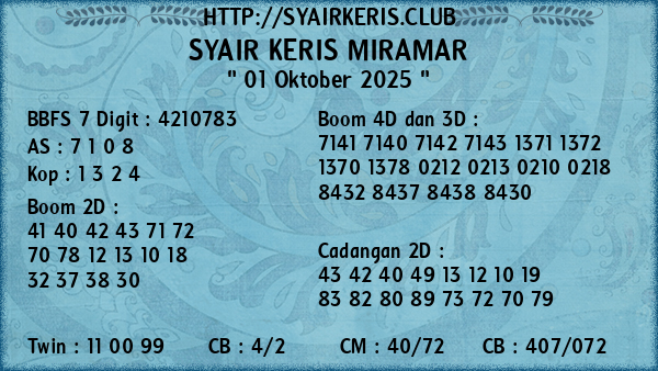 Prediksi Syair Keris Jitu Miramar Rabu, 01 Oktober 2025
