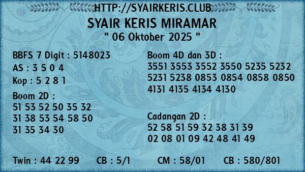 Prediksi Syair Keris Jitu Miramar Senin, 06 Oktober 2025