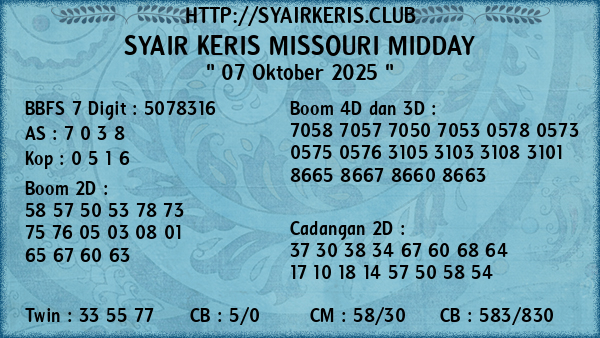 Prediksi Syair Keris Jitu Missouri Midday Selasa, 07 Oktober 2025