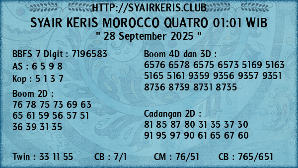 Prediksi Syair Keris Jitu Morocco Quatro 01:01 WIB Minggu, 28 September 2025