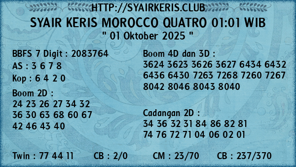 Prediksi Syair Keris Jitu Morocco Quatro 01:01 WIB Rabu, 01 Oktober 2025