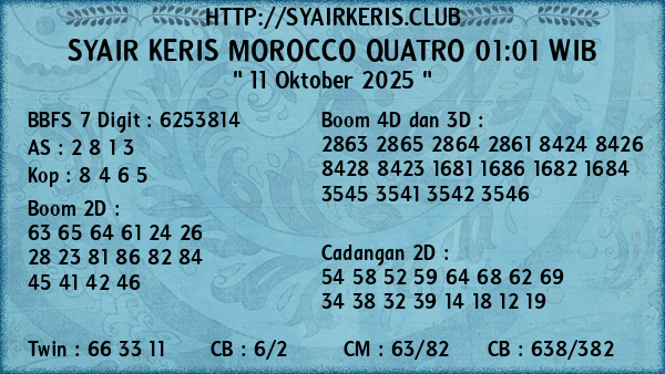Prediksi Syair Keris Jitu Morocco Quatro 01:01 WIB Sabtu, 11 Oktober 2025