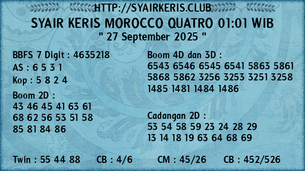 Prediksi Syair Keris Jitu Morocco Quatro 01:01 WIB Sabtu, 27 September 2025