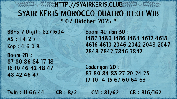 Prediksi Syair Keris Jitu Morocco Quatro 01:01 WIB Selasa, 07 Oktober 2025