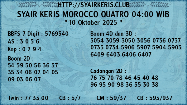 Prediksi Syair Keris Jitu Morocco Quatro 04:00 WIB Jumat, 10 Oktober 2025