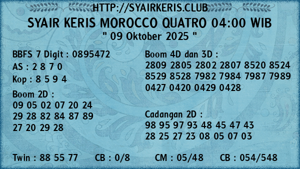 Prediksi Syair Keris Jitu Morocco Quatro 04:00 WIB Kamis, 09 Oktober 2025