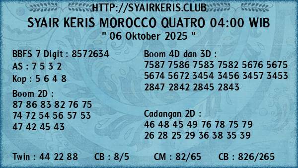 Prediksi Syair Keris Jitu Morocco Quatro 04:00 WIB Senin, 06 Oktober 2025