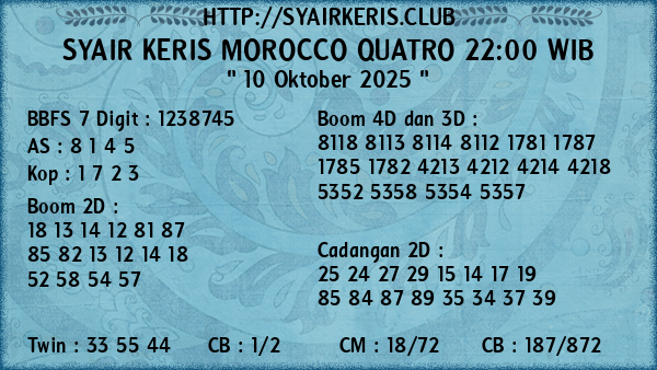 Prediksi Syair Keris Jitu Morocco Quatro 22:00 WIB Jumat, 10 Oktober 2025