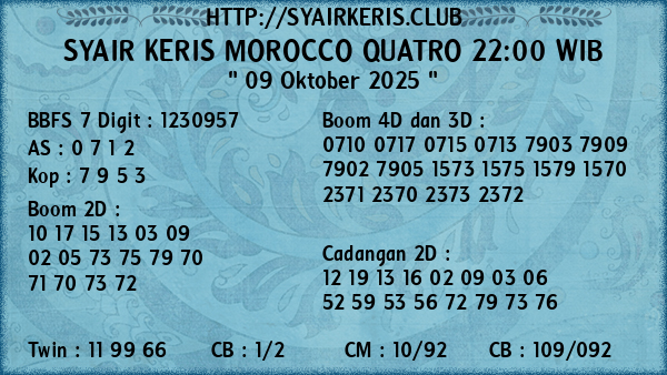 Prediksi Syair Keris Jitu Morocco Quatro 22:00 WIB Kamis, 09 Oktober 2025