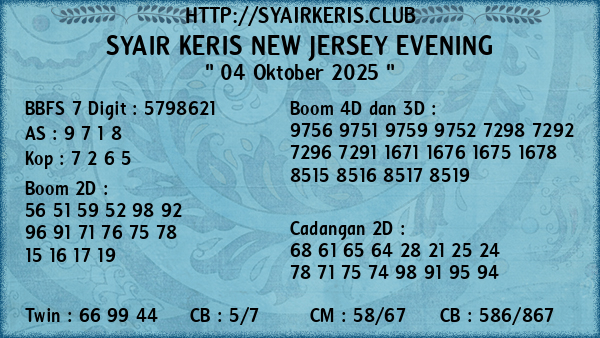 Prediksi Syair Keris Jitu New Jersey Evening Sabtu, 04 Oktober 2025