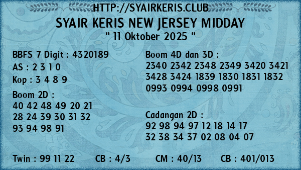 Prediksi Syair Keris Jitu New Jersey Midday Sabtu, 11 Oktober 2025