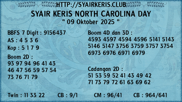 Prediksi Syair Keris Jitu North Carolina Day Kamis, 09 Oktober 2025