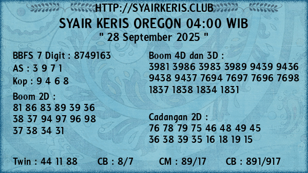 Prediksi Syair Keris Jitu Oregon 04:00 WIB Minggu, 28 September 2025