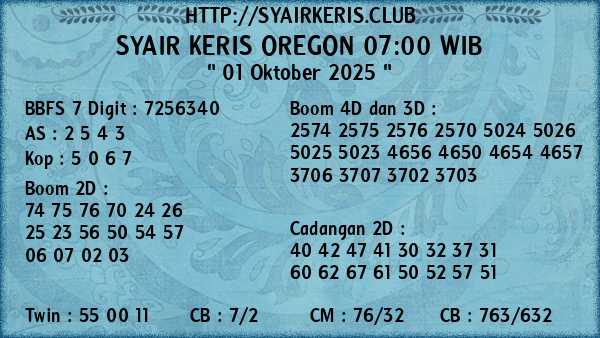 Prediksi Syair Keris Jitu Oregon 07:00 WIB Rabu, 01 Oktober 2025
