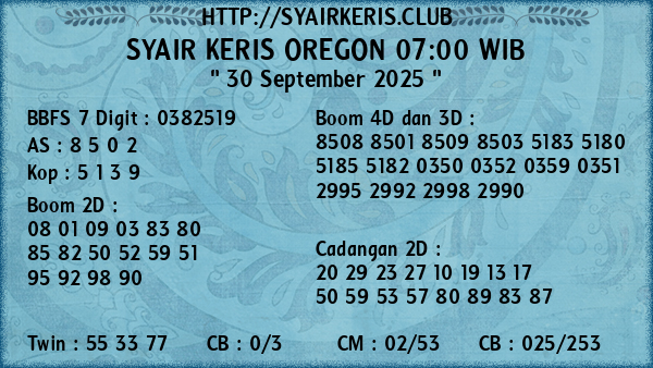 Prediksi Syair Keris Jitu Oregon 07:00 WIB Selasa, 30 September 2025