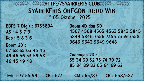 Prediksi Syair Keris Jitu Oregon 10:00 WIB Minggu, 05 Oktober 2025
