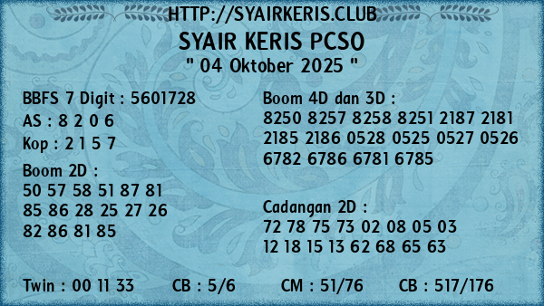 Prediksi Syair Keris Jitu Pcso Sabtu, 04 Oktober 2025