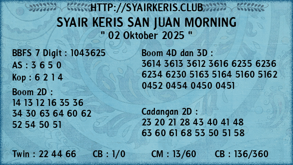 Prediksi Syair Keris Jitu San Juan Morning Kamis, 02 Oktober 2025