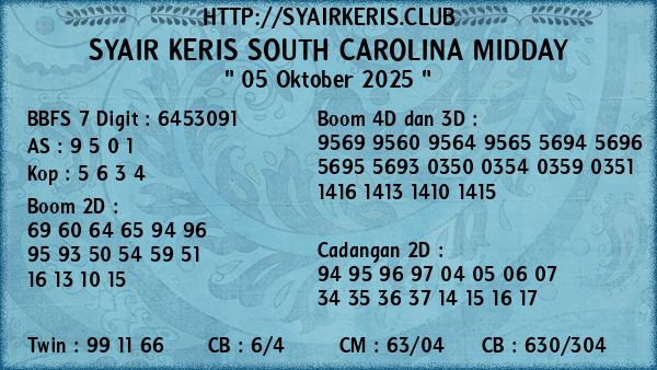 Prediksi Syair Keris Jitu South Carolina Midday Minggu, 05 Oktober 2025