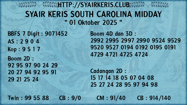 Prediksi Syair Keris Jitu South Carolina Midday Rabu, 01 Oktober 2025