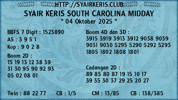 Prediksi Syair Keris Jitu South Carolina Midday Sabtu, 04 Oktober 2025