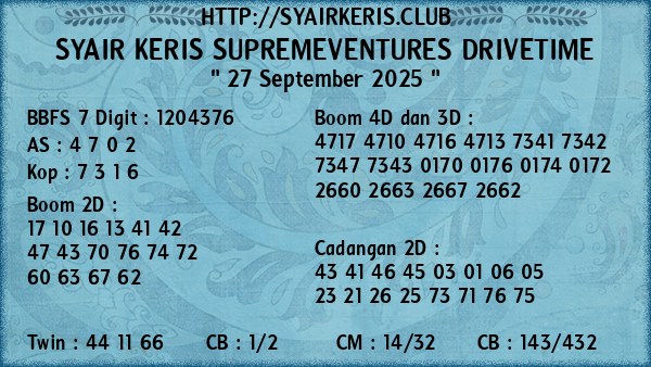 Prediksi Syair Keris Jitu Supremeventures Drivetime Sabtu, 27 September 2025