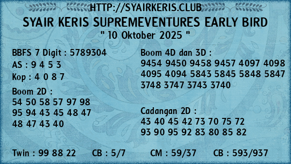 Prediksi Syair Keris Jitu Supremeventures Early Bird Jumat, 10 Oktober 2025