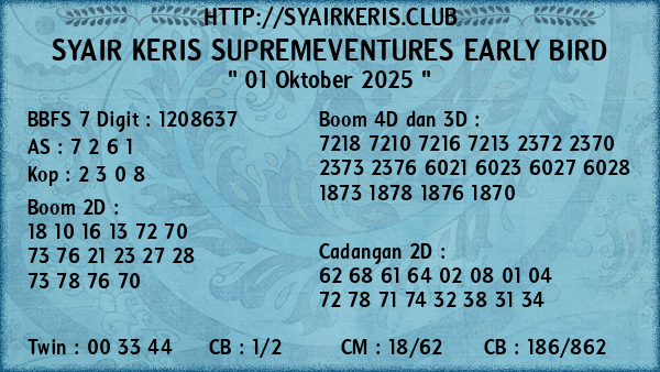 Prediksi Syair Keris Jitu Supremeventures Early Bird Rabu, 01 Oktober 2025