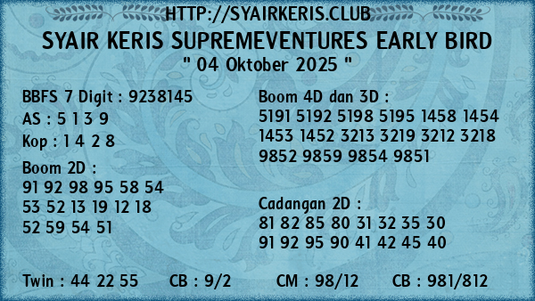 Prediksi Syair Keris Jitu Supremeventures Early Bird Sabtu, 04 Oktober 2025