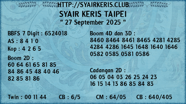 Prediksi Syair Keris Jitu Taipei Sabtu, 27 September 2025