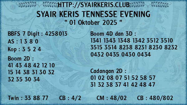 Prediksi Syair Keris Jitu Tennesse Evening Rabu, 01 Oktober 2025