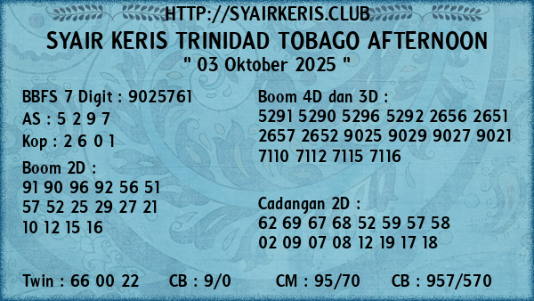 Prediksi Syair Keris Jitu Trinidad Tobago Afternoon Jumat, 03 Oktober 2025
